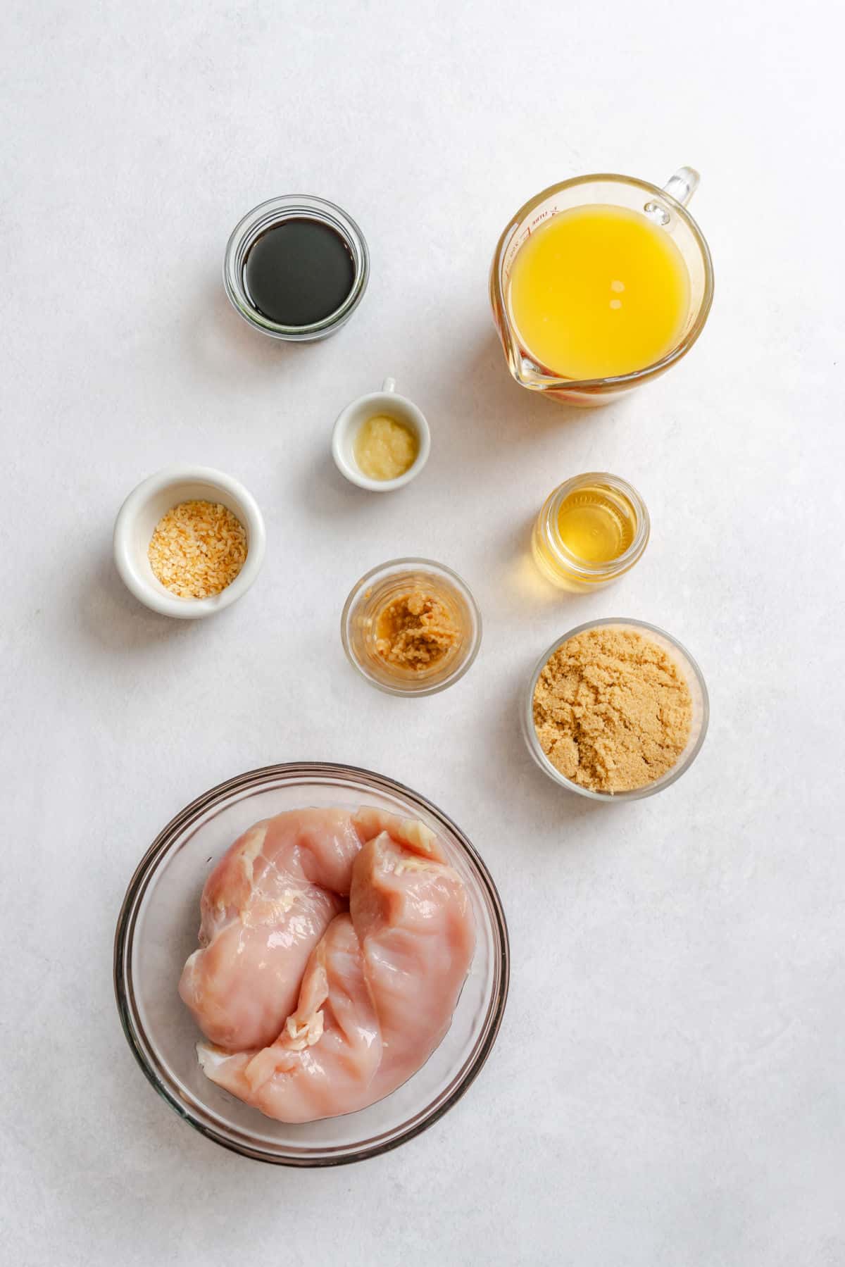 - Stir together the orange juice, brown sugar, bourbon, soy sauce, garlic, onion, and ginger in a medium bowl.1 cup fresh orange juice, ½ cup brown sugar, ¼ cup bourbon, ¼ cup lite soy sauce, 3 cloves garlic, 1 tablespoon minced onion, 1 teaspoon grated fresh ginger
