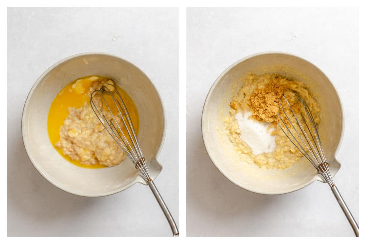 - In a large bowl, whisk mashed banana and melted butter together until well-combined.⅓ cup salted butter , 1 ½ cups mashed banana