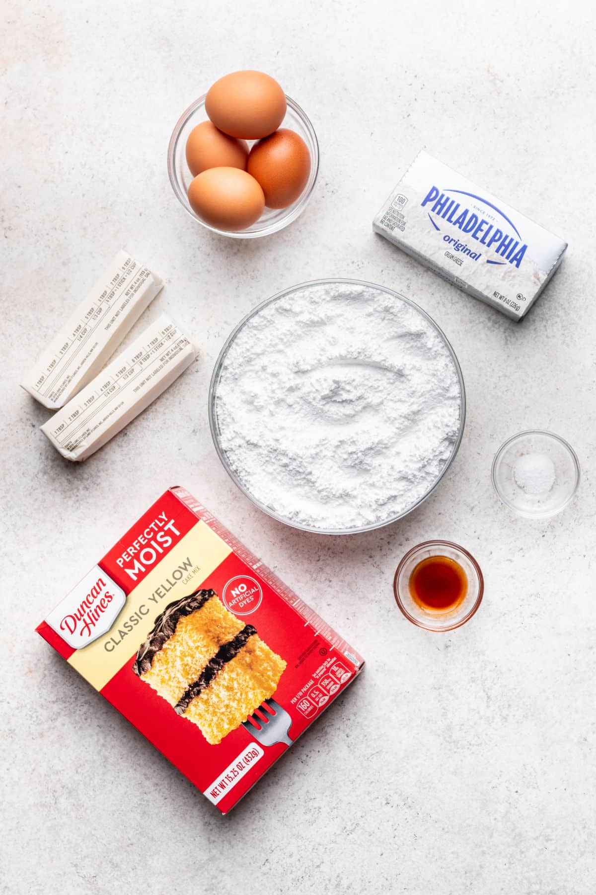 - Make the crust: To a large bowl, add yellow cake mix, melted butter, eggs, vanilla and salt. Stir together with a fork to create a dough.15.25 ounce package yellow cake mix, ½ cup unsalted butter, 2 large eggs, ½ teaspoon vanilla extract, ¼ teaspoon salt