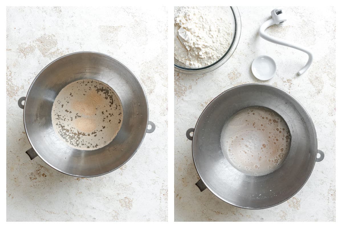 Step 1: In the bowl of a stand mixer, stir together the water, yeast, and sugar. Let stand for 5-10 minutes, or until yeast is foamy.