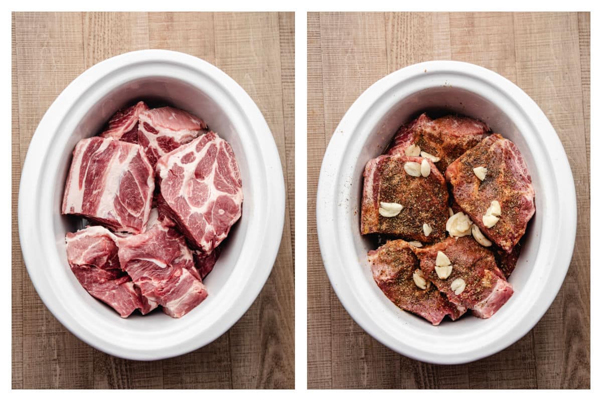 Step 2: Place the pork pieces in the slow cooker insert on top of the onions.