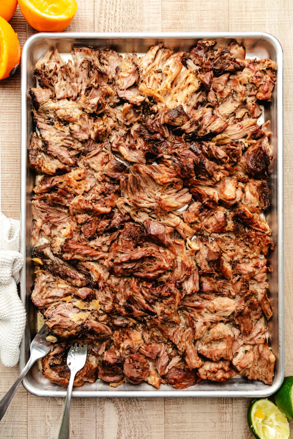 - Shred the pork and spread it into an even layer on the baking sheet. You can remove any excess fat, if you prefer.
