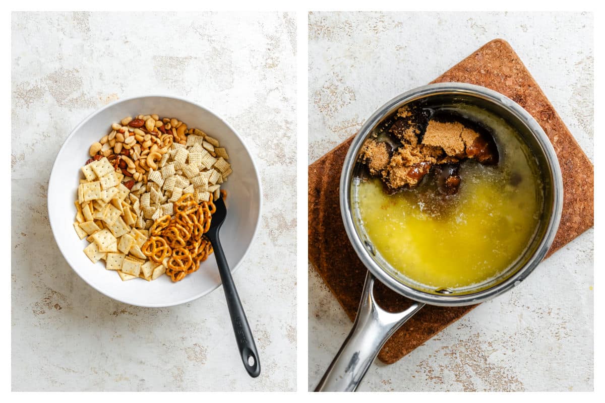 Step 1: Mix the cereal, crackers, pretzels, and nuts together. If you prefer not to use nuts, just sub in an equal amount of cereal, crackers, or pretzels instead.