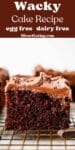 Wacky cake (depression cake or crazy cake) is a light and fluffy one bowl chocolate cake. This chocolate cake is made without eggs or dairy!